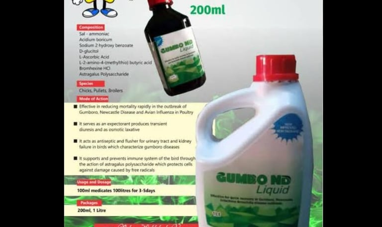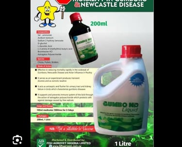 Gumbo-ND is a combined vaccine used to protect poultry against Gumboro disease (Infectious Bursal Disease) and Newcastle Disease at the same time. It helps stimulate strong immunity in young birds, reduces mortality and production losses, and simplifies vaccination programs by covering both major viral diseases in a single dose.